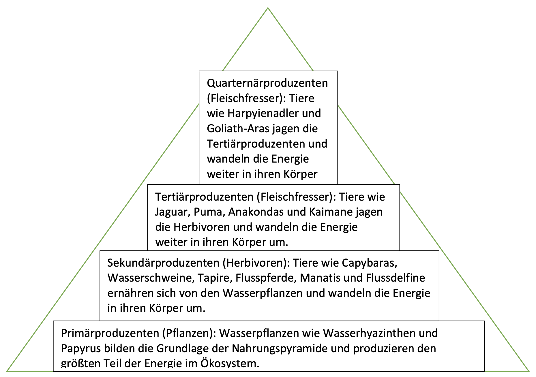 Sekundärproduzenten (Herbivoren): Tiere wie Capybaras, Wasserschweine, Tapire, Flusspferde, Manatis und Flussdelfine ernähren sich von den Wasserpflanzen und wandeln die Energie in ihren Körper um.
